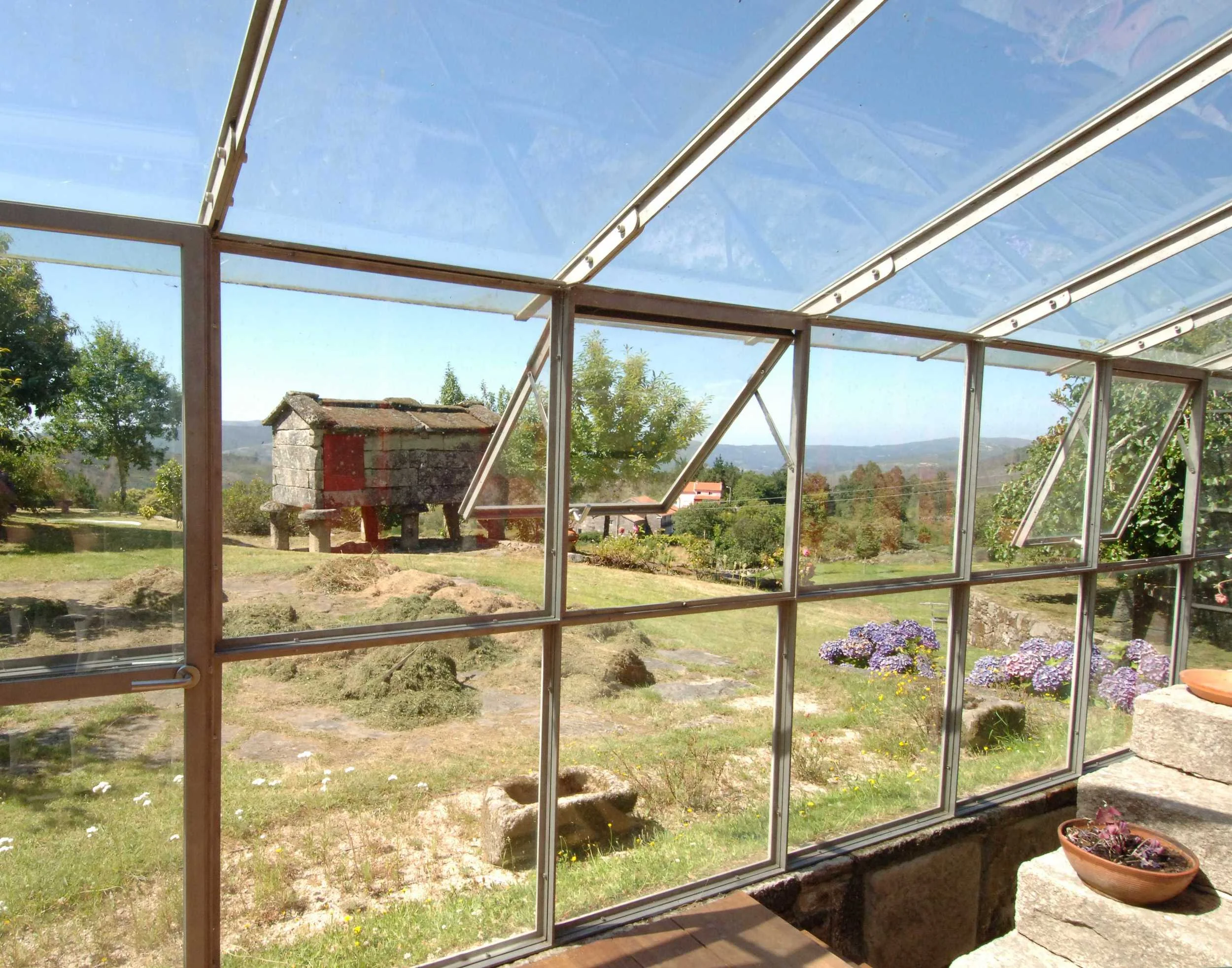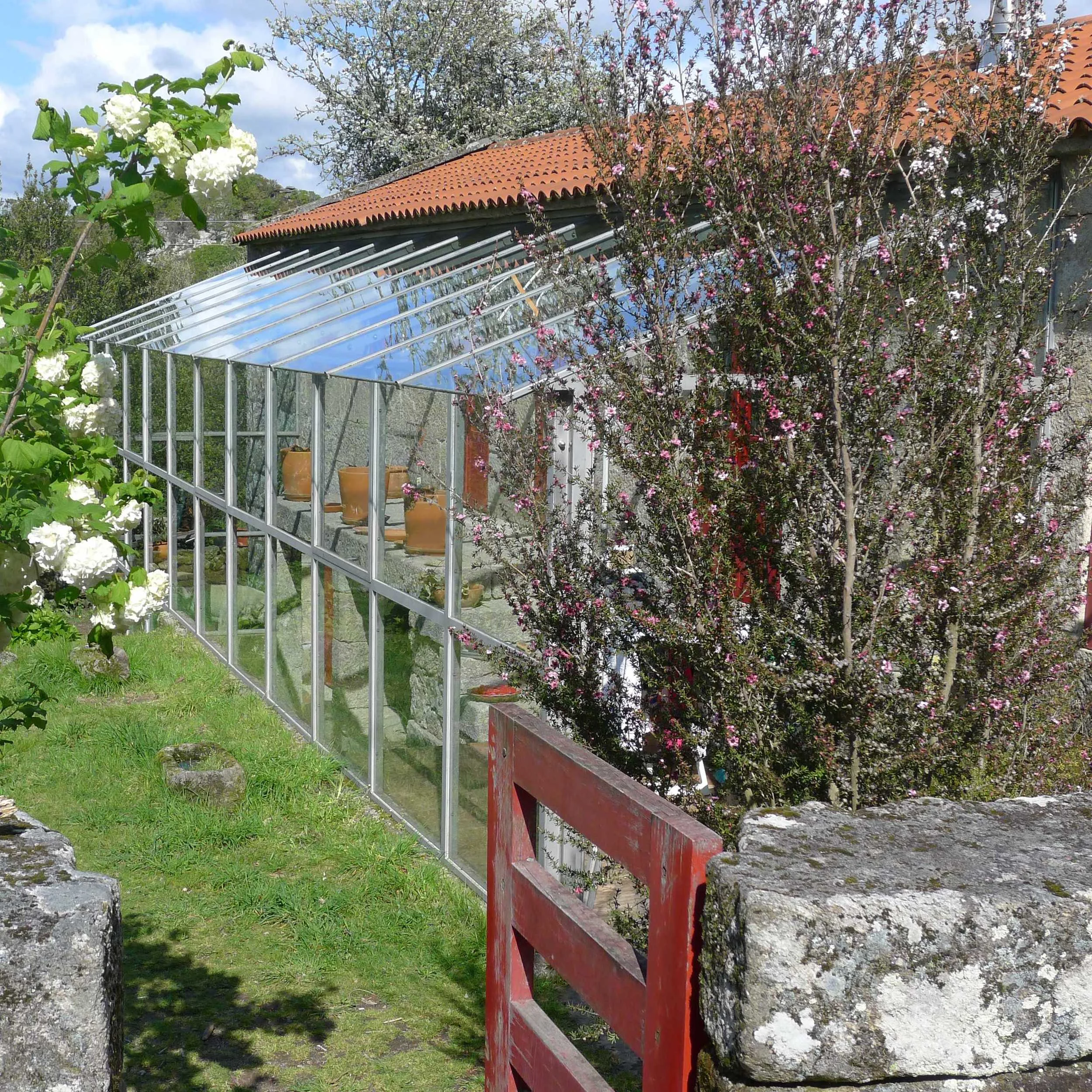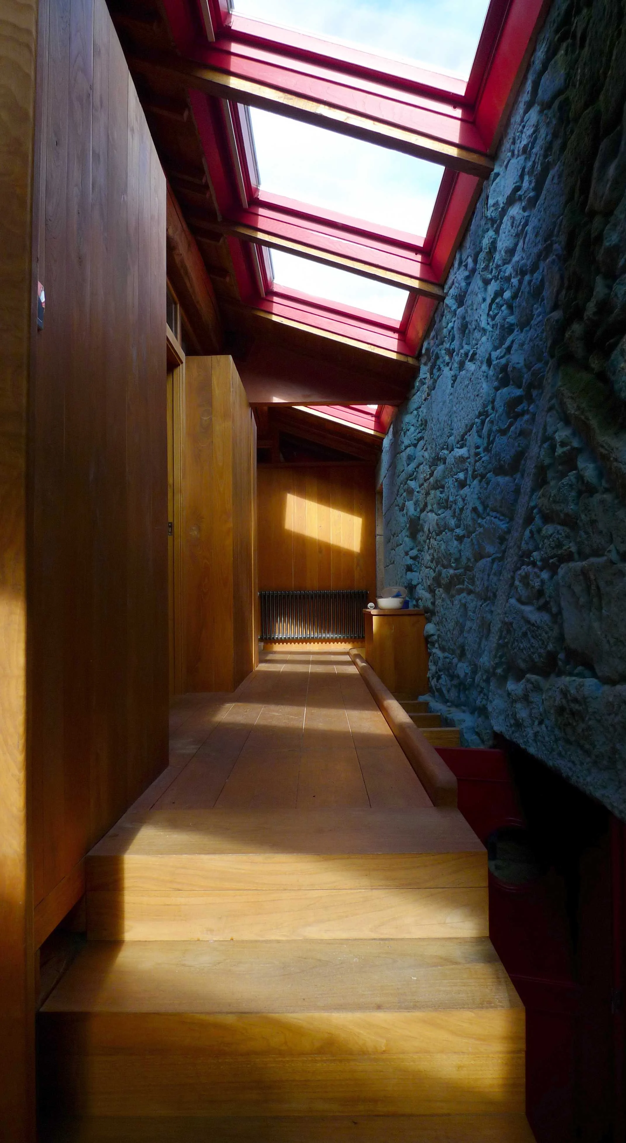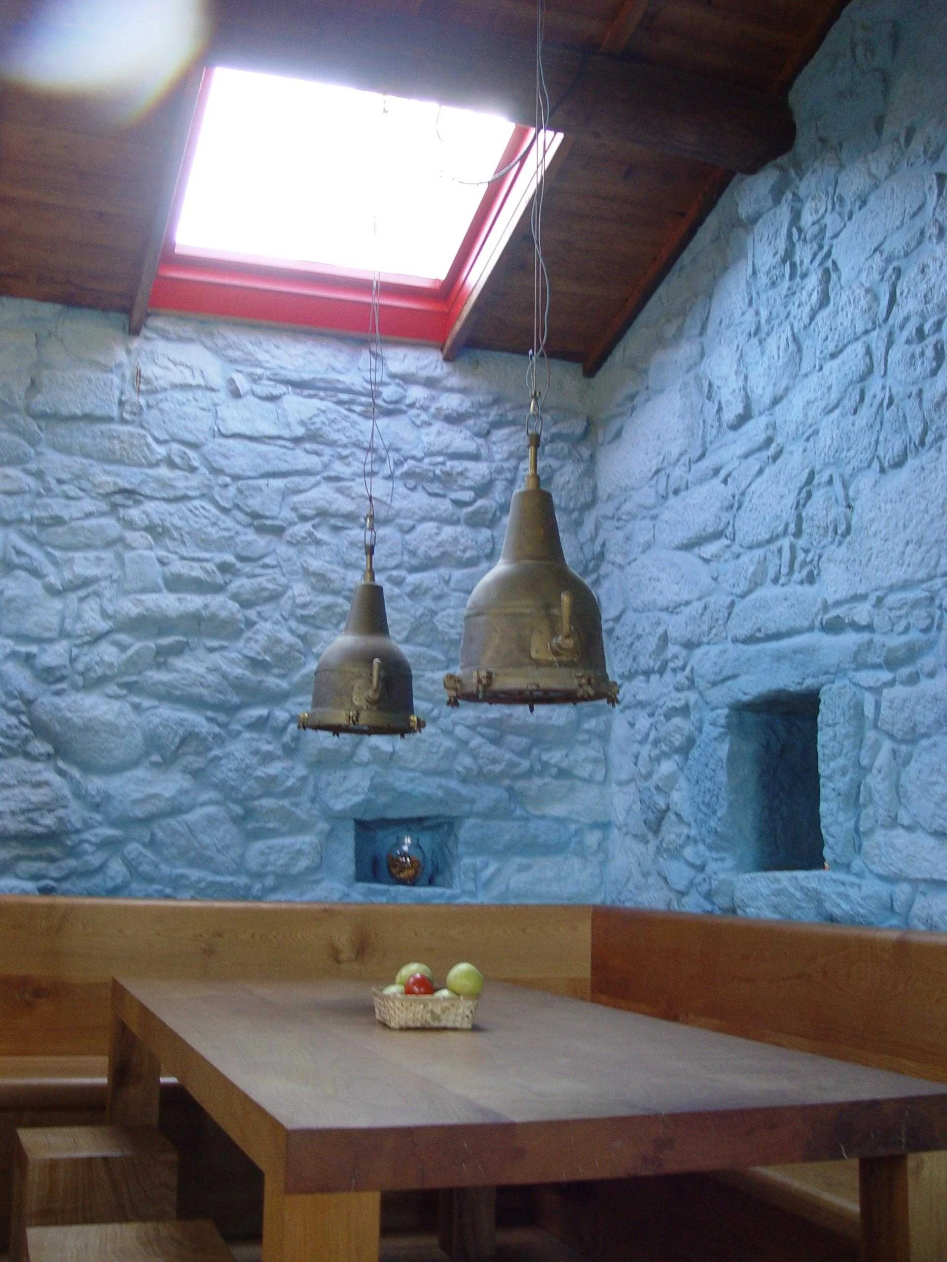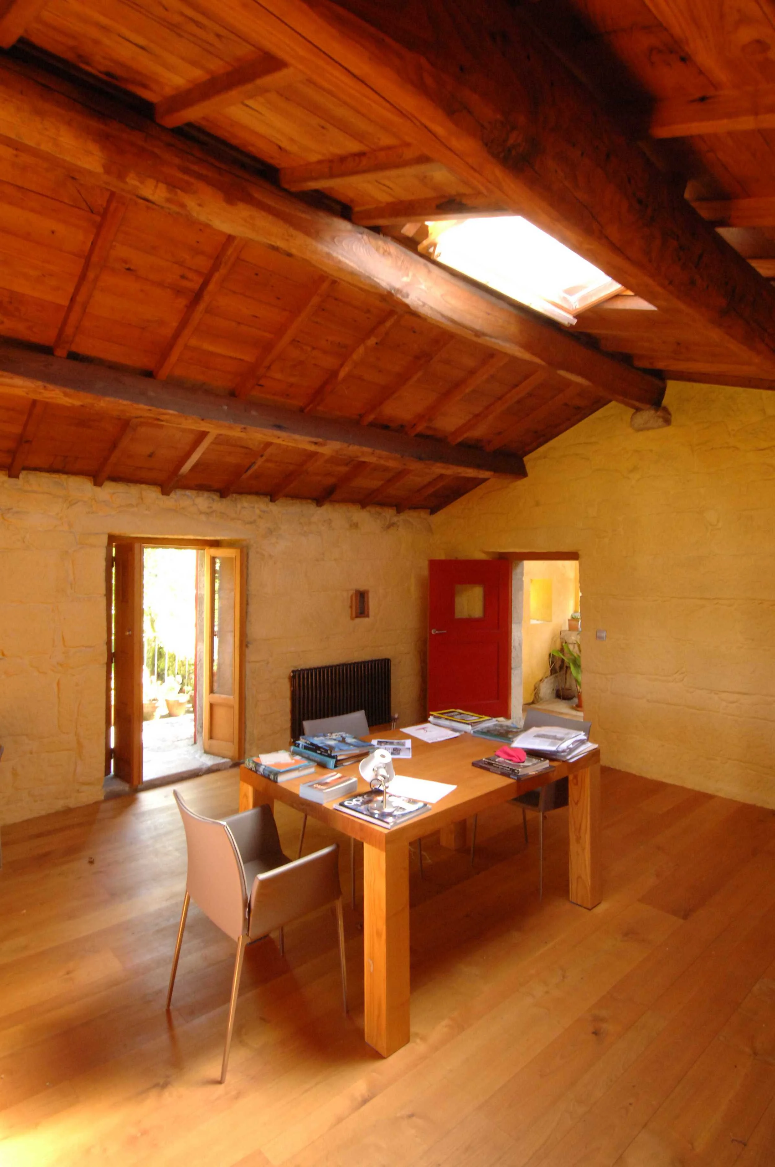 The reused stone walls are noteworthy architectural elements (some binding stones and others masonry): these were renovated and painted on the inside to make them warmer, more cheerful and more comfortable. Also, skylights were placed at several places on the roof to allow light to flow into different areas (kitchen-dining room, hallway, reading area, living room, hall-interior garden...). Furthermore, it was possible to attach a large gallery to the front over the vegetable garden whilst leaving the stone facade intact. This gallery (covered balcony) is protected from harsh weather (wind and rain) and allows the doors and windows in every room to be opened, enlarging the inner space and connecting and organising the entire building.